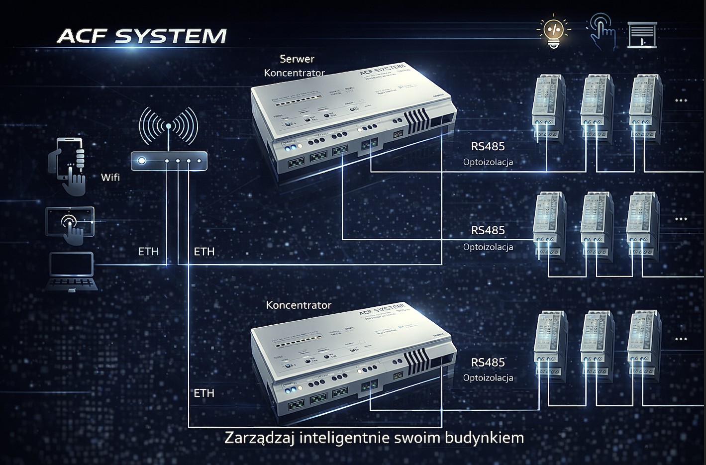 ACF System to nasz produkt, jest to zestaw urządzeń i komponentów programistycznych wpisujący się w ramy produktów z serii SmartHome. Oferujemy kompleksowe rozwiązanie, które umożliwia zarządzanie automatyką budynkową zarówno jako główny moduł zarządczy, ale także jako podsystem nadrzędnego BMS.