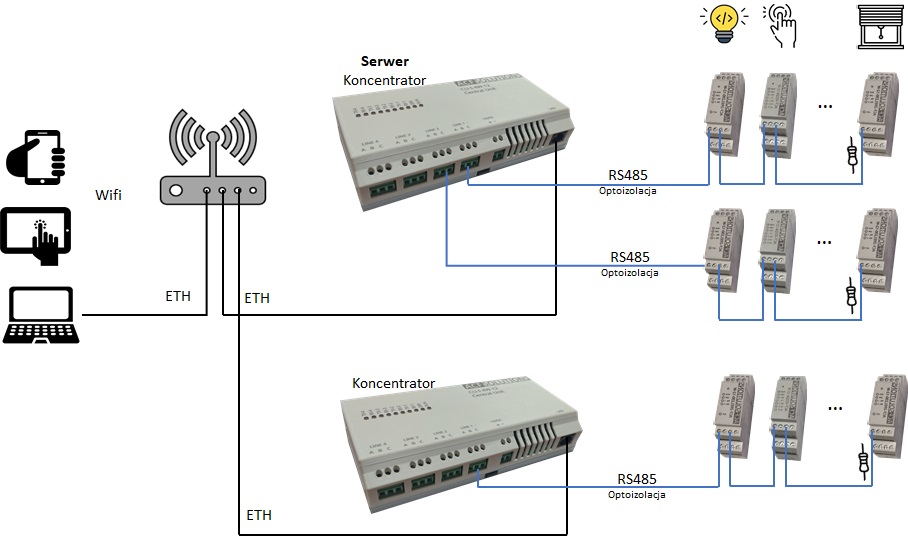 Na pokładzie jednostki centralnej działa również aplikacja Koncentratora. Jest to część systemu odpowiedzialna za komunikację z modułami wykonawczymi. Moduły wykonawcze odpowiedzialne są za sterowanie oświetleniem, roletami, odczytywaniem danych wejściowych np. stanu przycisków lub temperatury.